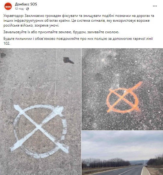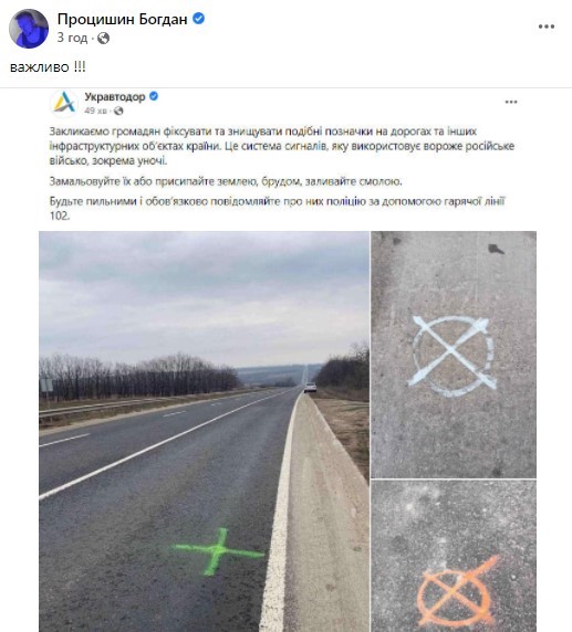 Украинские пользователи соцсетей активно распространяют пост Укравтодора, демонстрирующий вражеские отметки на объектах инфраструктуры Украины и призывающий их фиксировать и уничтожать.