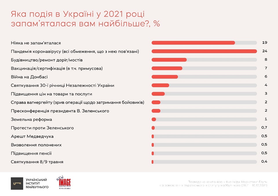 Так, с 8% "Большая стройка" заняла второе место в списке наиболее памятных событий года. Больше всего (24%) в этом году украинцы запомнили пандемию коронавируса и ограничения, связанные с ней. Среди других событий, которые запомнились украинцам, есть вакцинация и введение сертификатов (7%), война на Востоке Украины (6%) и празднование 30-й годовщины независимости (4%).