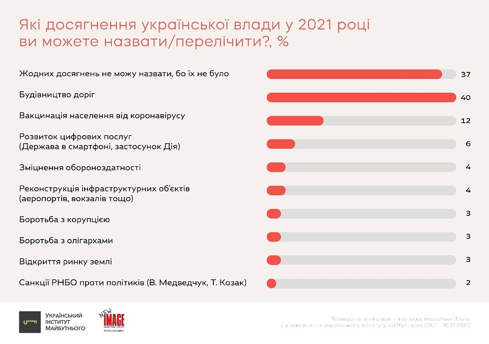 "Молодежь до 24 лет почти вдвое больше (56%) называет достижением власти за 2021 год строительство дорог, чем люди старшего возраста (30%), а также в три раза чаще упоминает о развитии цифровых услуг, таких как приложение "Дія" (13%) по сравнению с людьми 55 лет и старше (4%)", - говорится в исследовании.