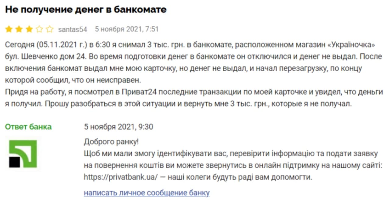 По словам мужчины, утром 5 ноября он хотел снять деньги с карты "ПриватБанка" в банкомате, расположенном в одном из магазинов. Он планировал получить 3 тысячи гривен, ввел указанную сумму, однако банкомат отключился при подготовке к выдаче банкнот.