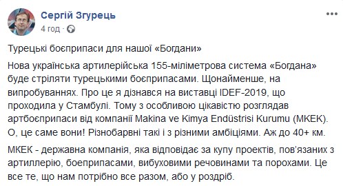 Згурец рассказал, что об использовании турецких боеприпасов он узнал на выставке IDEF-2019 в Стамбуле.