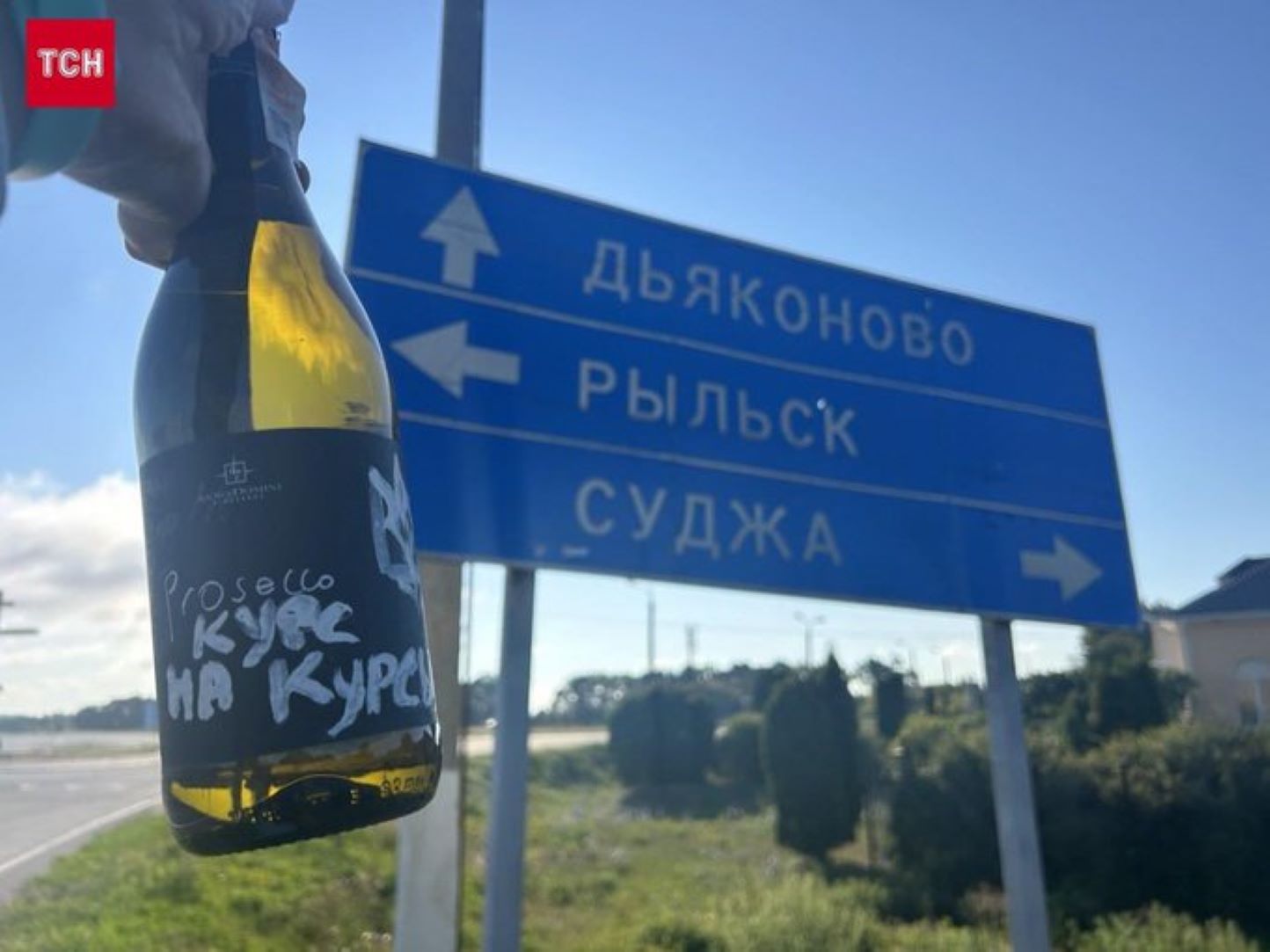 Журналистка Наталья Нагорная, которая вела первый репортаж из российского города Суджа, поделилась фотографией "исторической" бутылки Prosecco с надписью "курс на Курск".