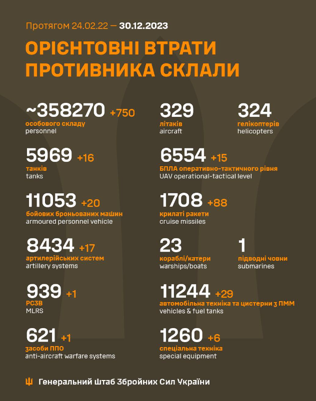 Так, общие боевые потери российской оккупационной армии с 24 февраля 2022 года по 30 декабря 2023 года примерно составили: