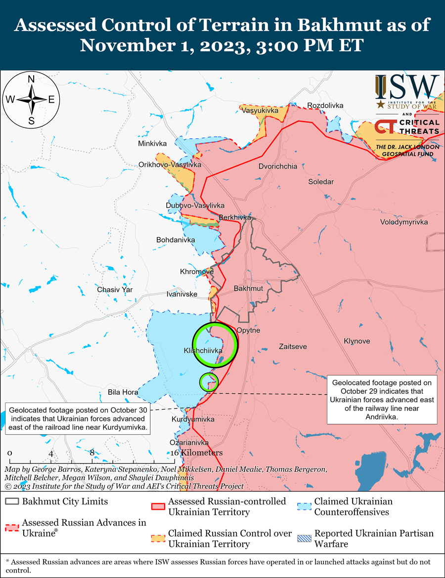 По словам института, 1 ноября российские войска продолжили наступательные операции вблизи Авдеевки и, как сообщается, продвинулись вперед. Известный российский военный блоггер заявил, что российские войска, включая мобилизованных военнослужащих из Сибири, продвинулись с позиций в Красногоровке через железнодорожные пути в направлении Новокалиново и Керамика.