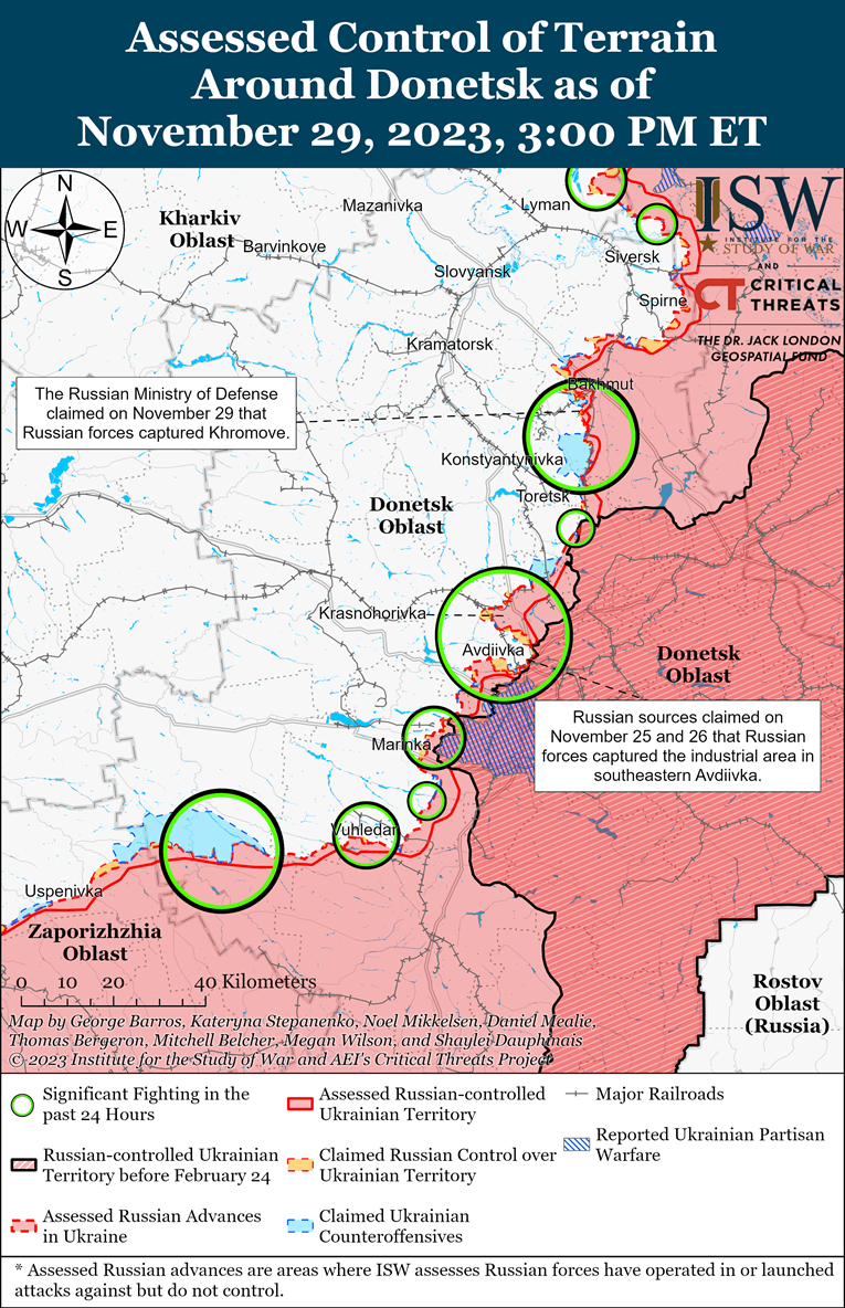 ISW сообщает, что российские войска 29 ноября продолжили наступательные операции на Бахмутском направлении и продвинулись вперед. Российские источники в свою очередь утверждали, что боевые действия продолжаются к северо-западу и юго-западу от Бахмута, а украинский военный отметил, что ситуация к юго-западу от Бахмута вдоль линии Клищиевка-Андреевка-Курдюмовка особенно сложна из-за увеличения количества российских атак.