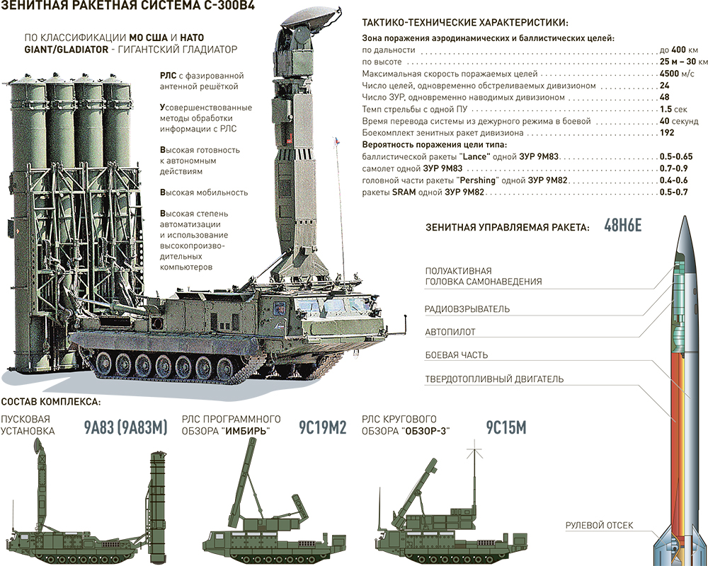 В настоящее время комплекс ЗРК С-300В4 является новейшим представителем семейства военной ПВО, а от предшественников отличается тем, что способен применять новые типы ракет. Благодаря этому С-300В4 умеет поражать аэродинамические и баллистические цели, превышающие скорость звука в 4 раза, на дальностях до 400 км и высотах до 30-35 км.