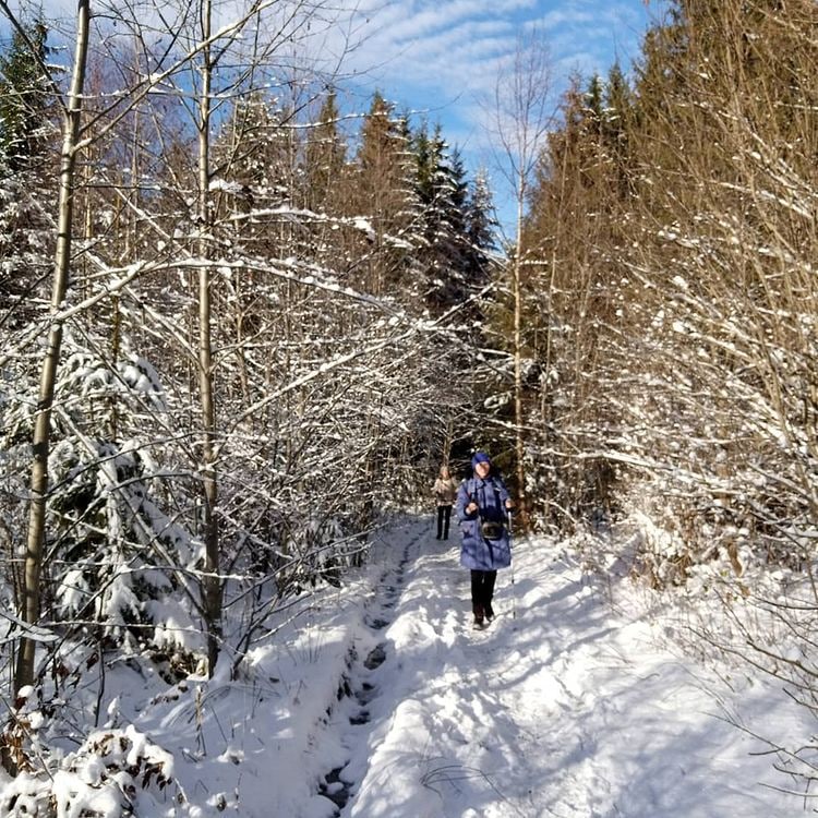 Землю укрыло как будто белым покрывалом, природа похожа на сказку. Туристы любуются зимой в ноябре и гуляют посреди красивой местности, фотографируя картину вокруг.