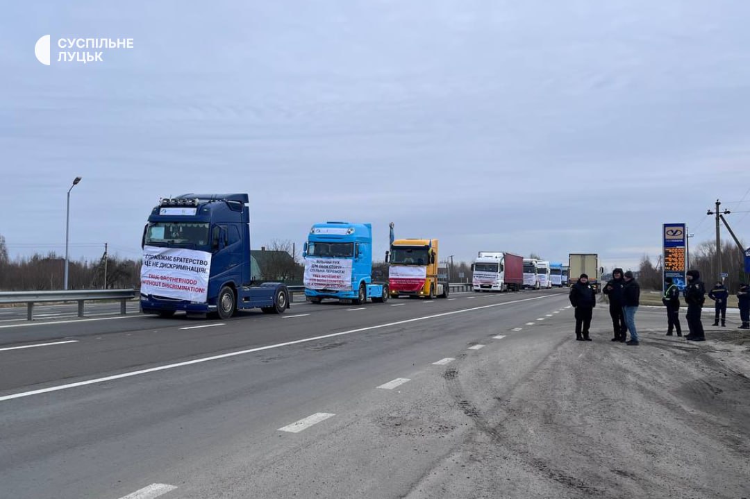 Акция протеста стартовала в 11:00. На месте проведения акции дежурят правоохранители. На грузовиках водители разместили плакаты с надписями на украинском, польском и английском языках.