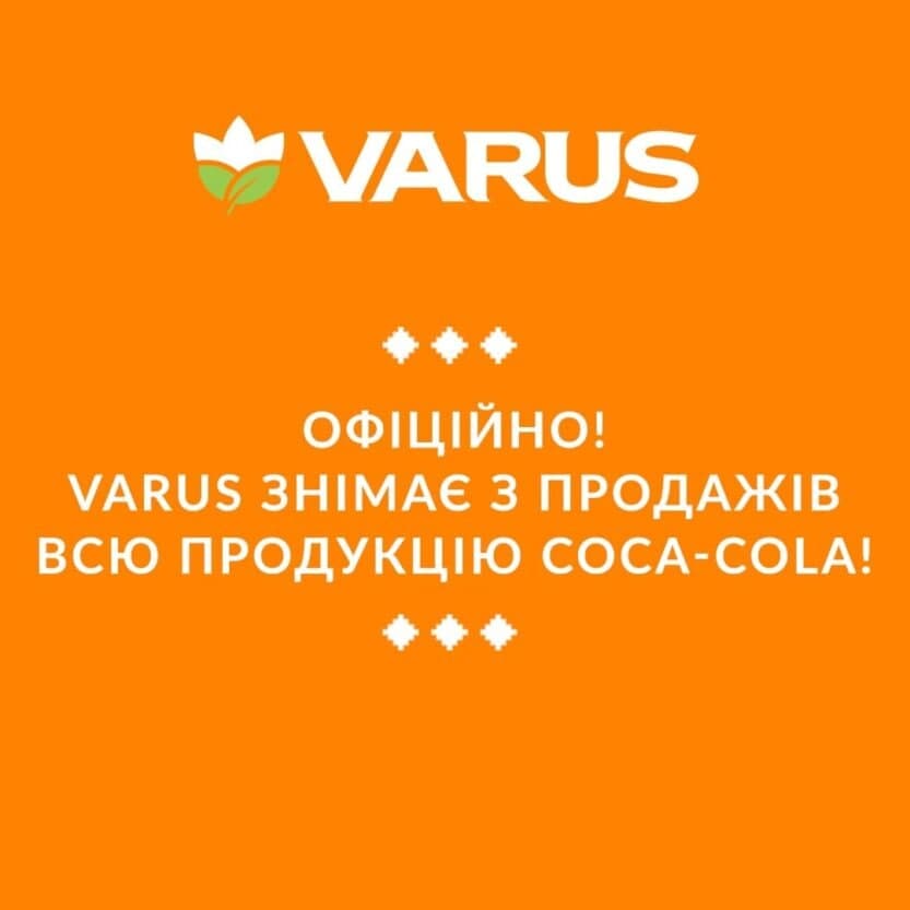 "Теперь в магазинах Novus и Varus вы не увидите ни одного товара, принадлежащего к бренду Coca-Cola. Его немедленно убирают с полок всех магазинов. Это Rich, Schweppes, Sprite, Burn, BonAqua, Fanta, Monster, Fuzetea, Coca-Cola", - говорится в сообщении.