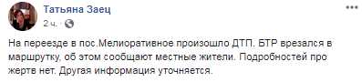"На переезде в пос. Мелиоративное произошло ДТП. БТР врезался в маршрутку, об этом сообщают местные жители. Подробностей про жертв нет. Другая информация уточняется", - говорится в сообщении.