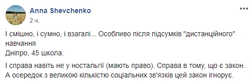 "И смешно, и грустно, и вообще ... Особенно после итогов "дистанционного" обучения. Днепр, 45 школа. И дело даже не в ностальгии (имеют право). Дело в том, что есть закон. А центр с большим количеством социальных связей этот закон игнорирует", - пишет автор публикации.