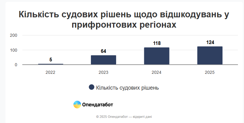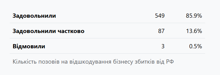В целом с начала полномасштабного вторжения украинские суды вынесли 639 решений о возмещении убытков. В подавляющем большинстве случаев – 85% – требования компаний были удовлетворены полностью. Только три иска (0,5%) получили отказ.