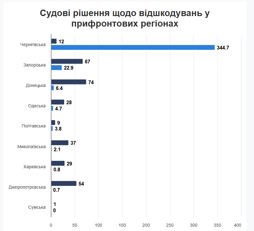 В частности, среди бизнеса из прифронтовых регионов, больше всего решений о взыскании убытков вынесено в Донецкой (74), Запорожской (67) и Днепропетровской (54) областях. Далее идут Николаевская (37) и Харьковская (29) области.