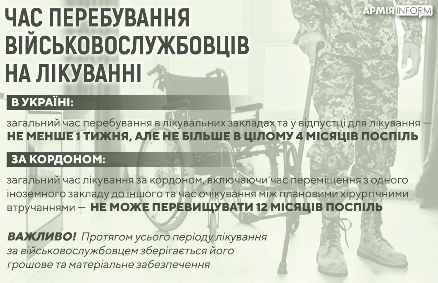 Общее время непрерывного пребывания военнослужащего в учреждениях здравоохранения и отпуске для лечения в связи с болезнью или в отпуске для лечения после ранения составляет не менее недели и не может превышать в общей сложности четырех месяцев подряд, кроме случаев, когда законодательством предусмотрено более длительные сроки пребывания на лечении.