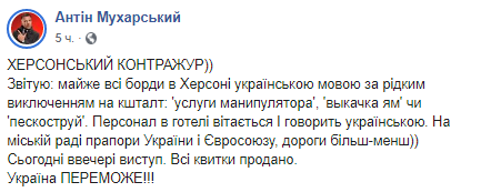 "Херсонский контражур)) Отчитываюсь: почти все борды в Херсоне на украинском языке за редким исключением вроде: "услуги манипулятора", "выкачка ям" или "пескоструй". Персонал в отеле приветствуется и говорит на украинском. На городском совете флаги Украины и Евросоюза, дороги более-менее))", - пишет певец.