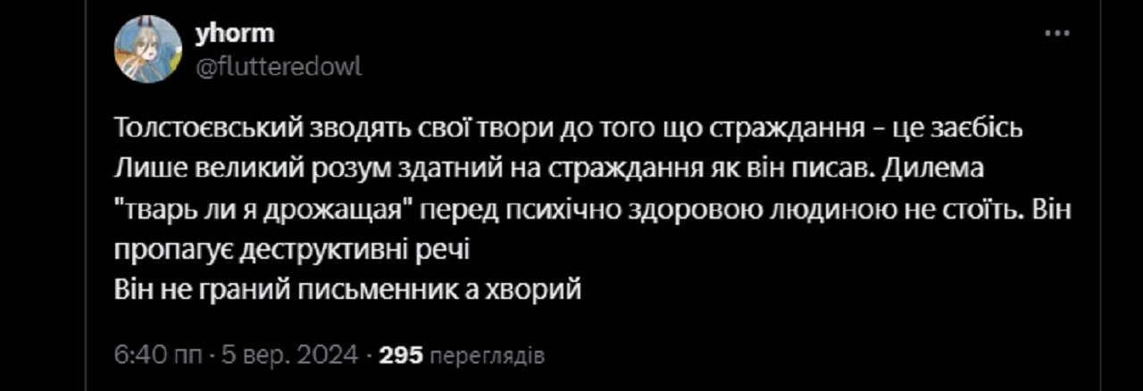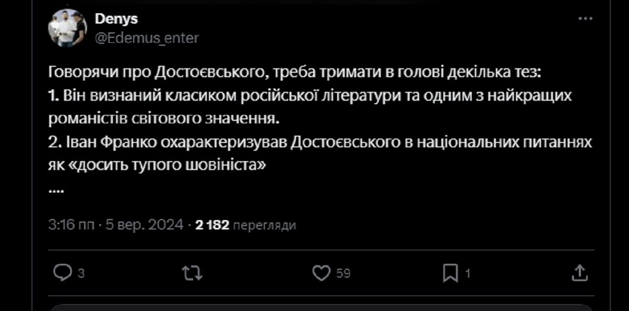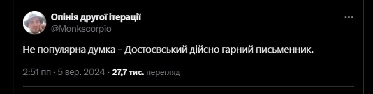 Военнослужащий ВСУ из Харькова под ником "Опиния второй итерации" отметился положительным твитом о российском писателе Федоре Достоевском.