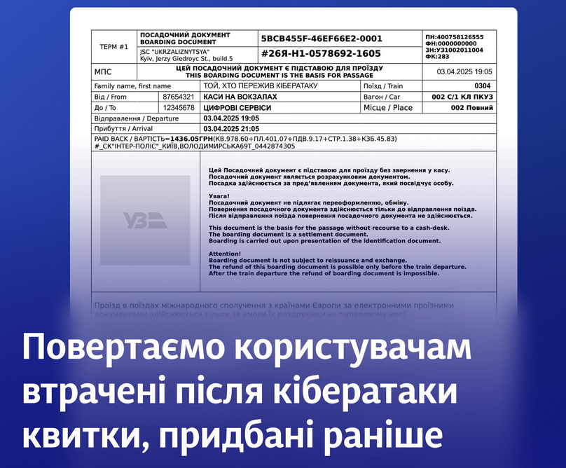 Национальный перевозчик "Укрзализныця" сообщил, как вернуть пассажирам утраченные после кибератаки билеты на поезда.