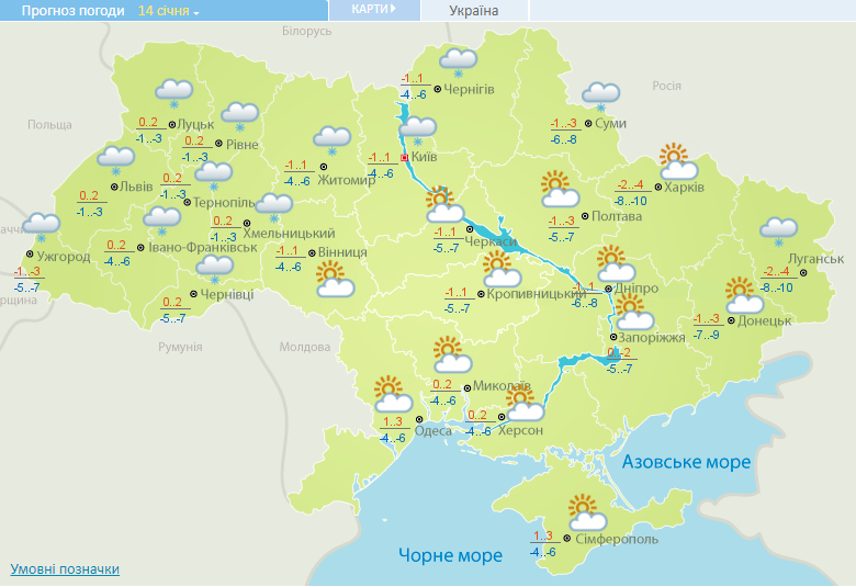 14 января, в пятницу, в Украине будет солнечно с прояснениями, без существенных осадков, кроме севера и запада, и частично востока (в Луганске) – там прогнозируют снег. Существенно потеплеет: температура воздуха в течение суток составит -1…+1 градус на севере и в центре. На западе днем - 0...+2 градуса, а ночью будет ночью -1...-3 градуса, в Карпатах ночью - -5...-7 градусов. На востоке в течение суток -1...+1 градус, ночью -6...-8 градусов. На юге 0...+2 градуса днем, ночью -4...-6 градусов.