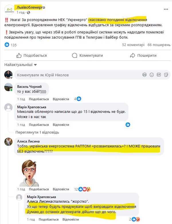 "Пусть думает, что ситуация "сложная, но контролируемая". А то что оборудование погорело без всяких обстрелов - этого лучше не знать. А то еще уволит Галущенко ненароком. И хотя это (как видно по комментариям на скрине) привело только к очередному витку недоверия к власти и запуску новых фейков – так это же не проблемы Галущенко, потому что ему же на выборы не идти. Поэтому пусть Зеленский выкручивается потом", - отметил журналист.