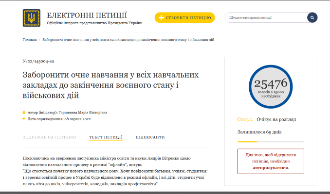Автор петиции Мария Горшенова написала о просьбе введения запрета на обучения в учебных заведениях в офлайн-формате до окончания войны. Причиной указывает то, что не все учебные заведения оборудованы бомбоубежищами и путями эвакуации. В частности, в зданиях могут быть очень узкие коридоры и лестничные пролеты. Также воздушные тревоги не дают ученикам сконцентрироваться на обучении, ко всему – их продолжительность может быть очень долгой.
