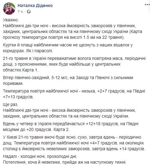 Об этом в Facebook написала известный украинский синоптик Наталья Диденко.