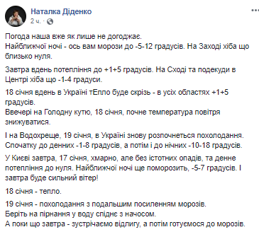 "В Киеве завтра, 17 января, облачно, но без осадков, и дневное потепление до нуля. Ближайшей ночью еще поморозит, -5-7 градусов. И завтра будет сильный ветер!", - резюмировала Диденко.