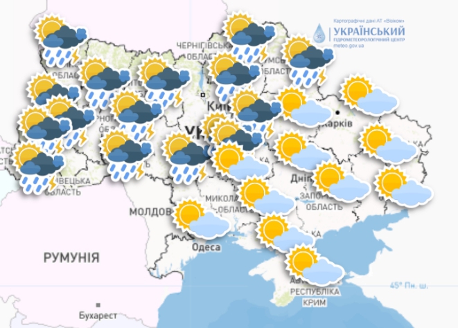 Ночью в западных, Житомирской и Винницкой, днем и в Киевской, Черкасской, Кировоградской, Черниговской и Сумской областях кратковременные дожди, местами грозы; на остальной территории без осадков. Ветер переменных направлений, 3-8 м/с, при гроз местами порывы 15-20 м/с.