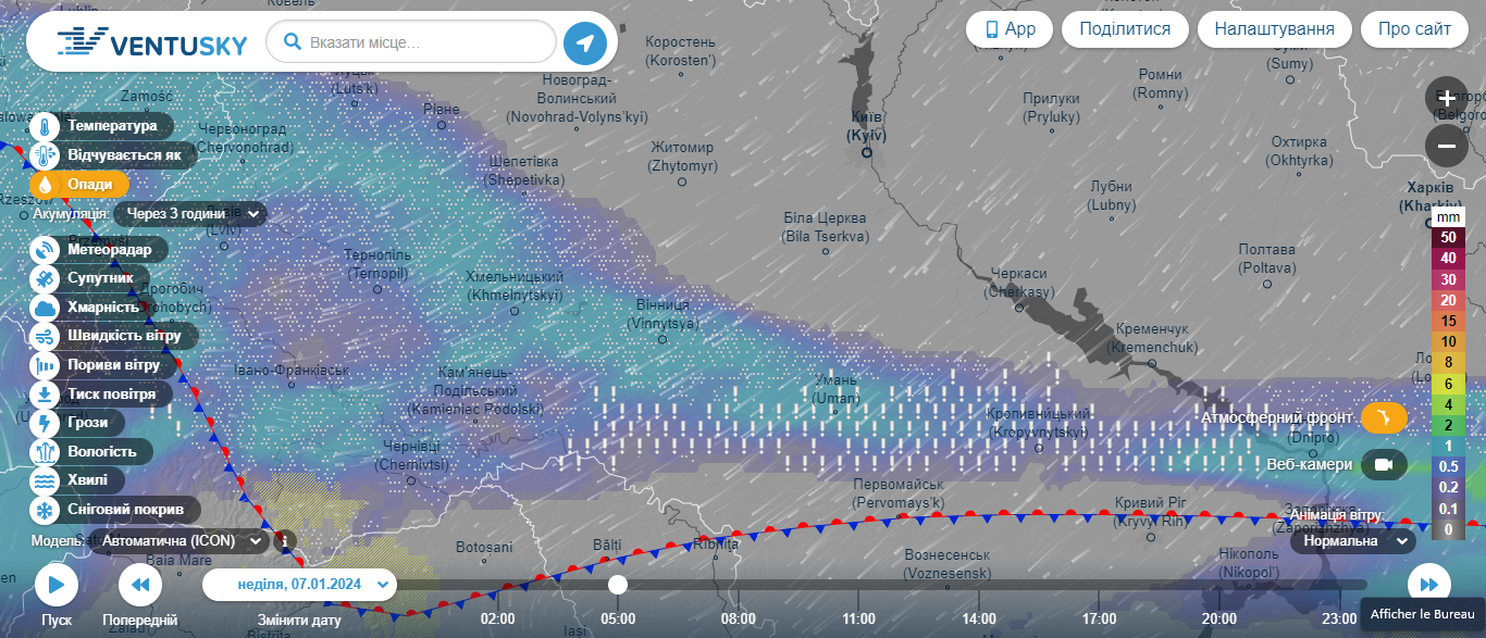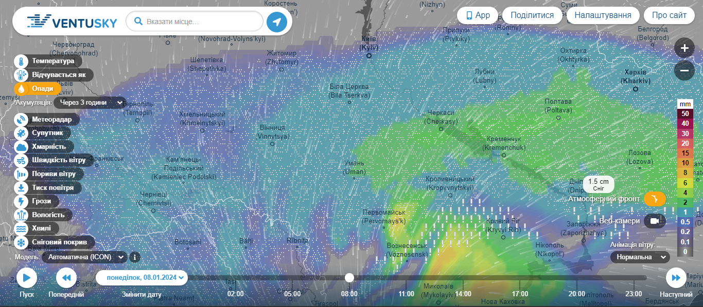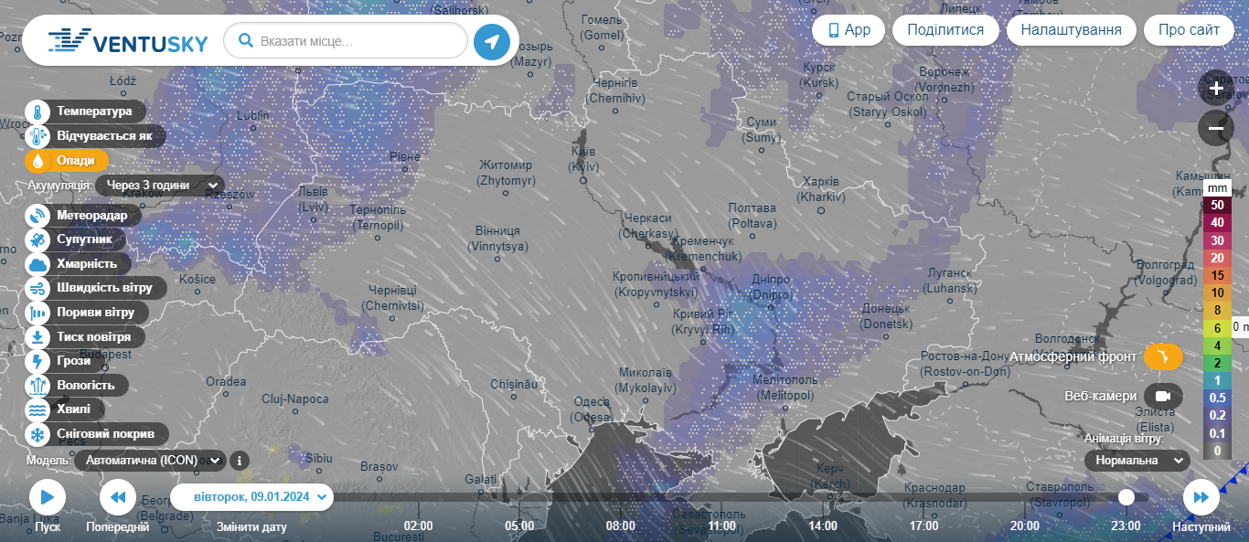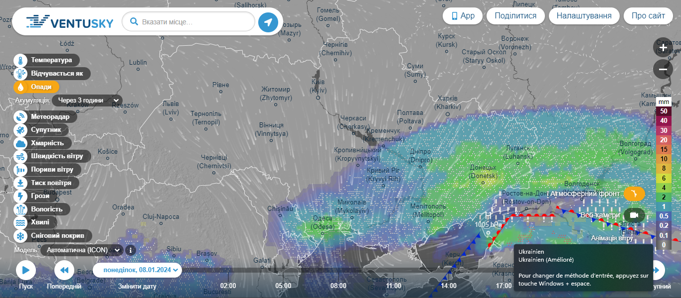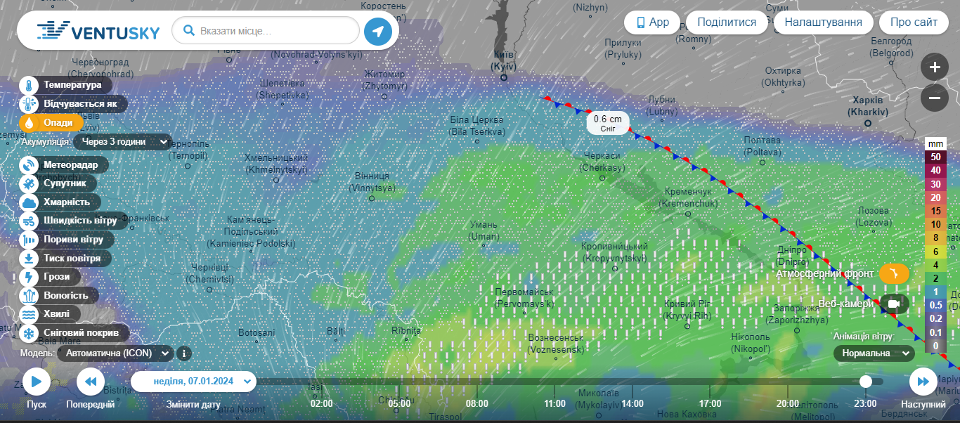 Вечером 7 января ледяные дожди переместятся в центр страны и накроют Черкасскую и Полтавскую области. Обильные осадки ожидаются на юге страны, вдоль линии фронта.