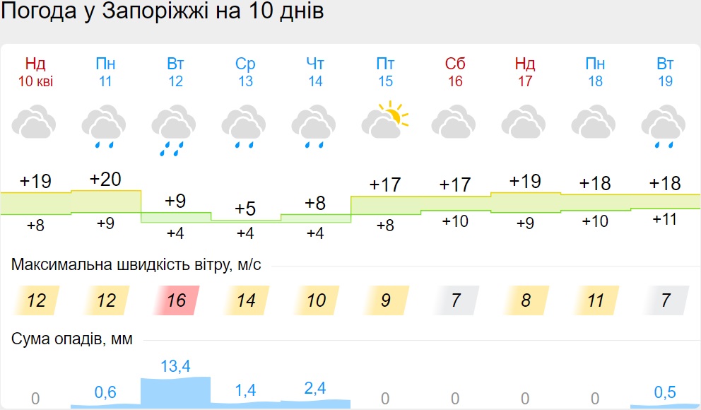 На вторник, 19 апреля, синоптики передают дожди в Винницкой, Запорожской, Волынской, Тернопольской, Львовской, Харьковской и Черниговской области.