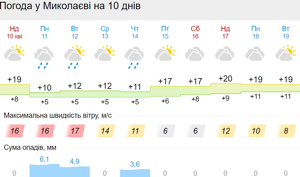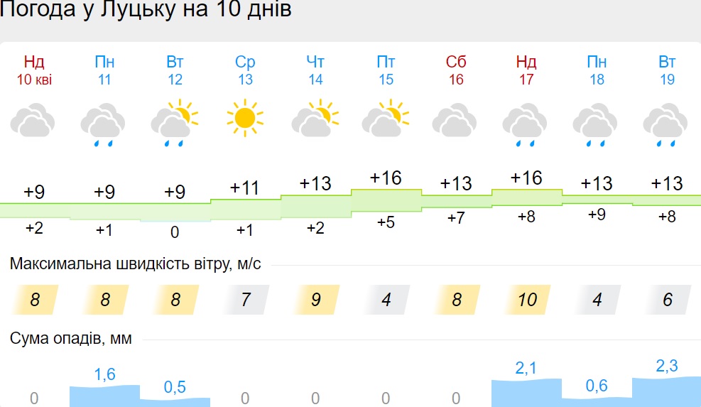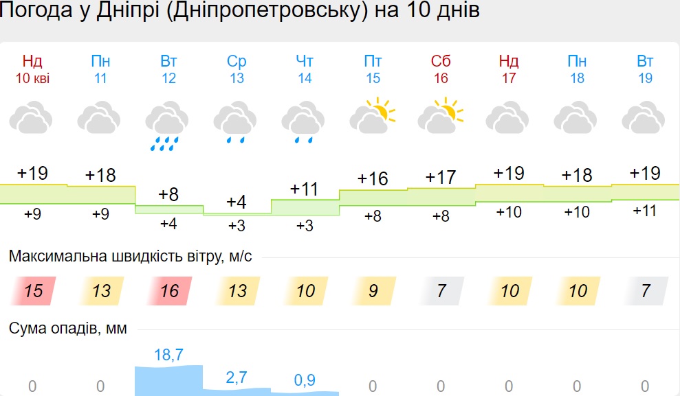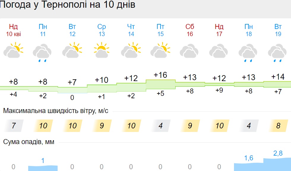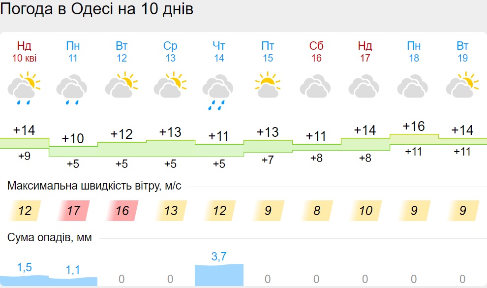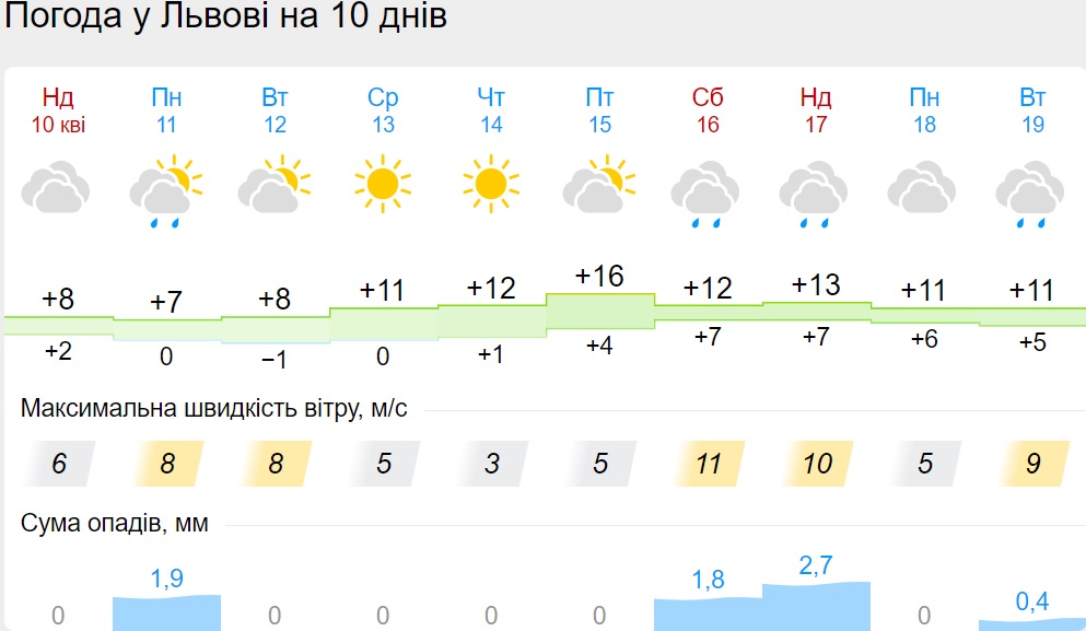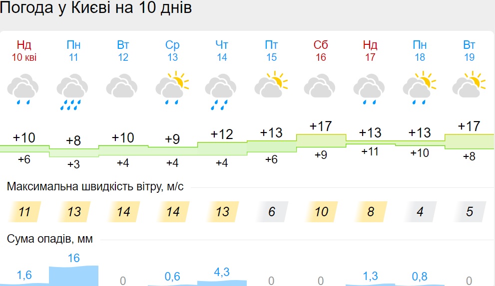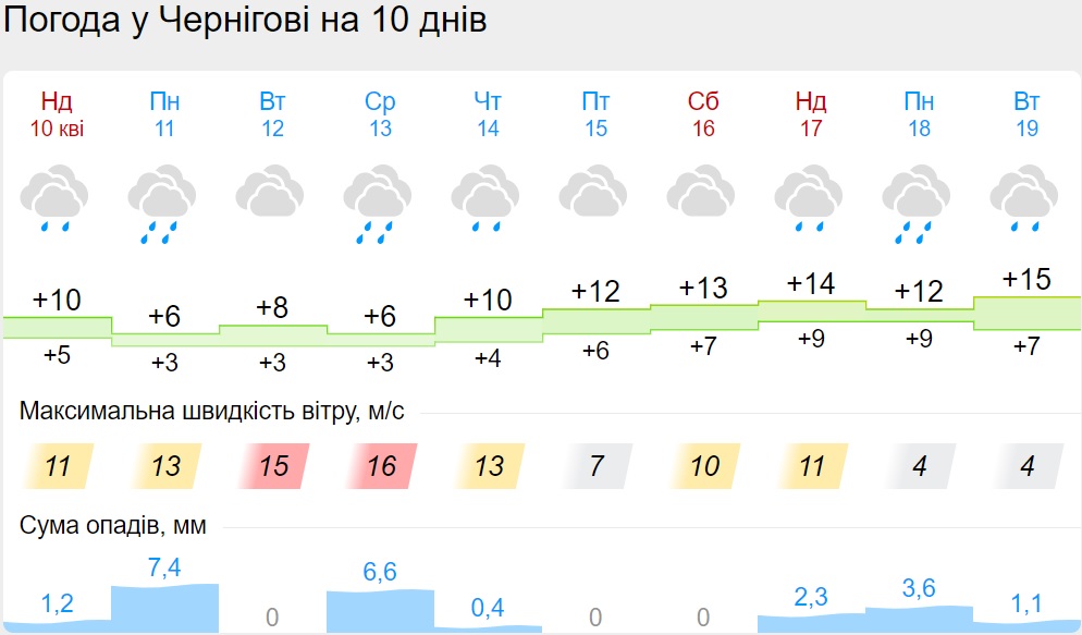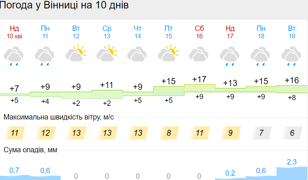 В пятницу, 15 апреля, будет сухая погода. 16 апреля дождь поморосит только во Львовской области. Но уже в воскресенье, 17 апреля, дожди снова накроют несколько областей: Винницкую, Киевскую, Львовскую, Волынскую, Черниговскую.