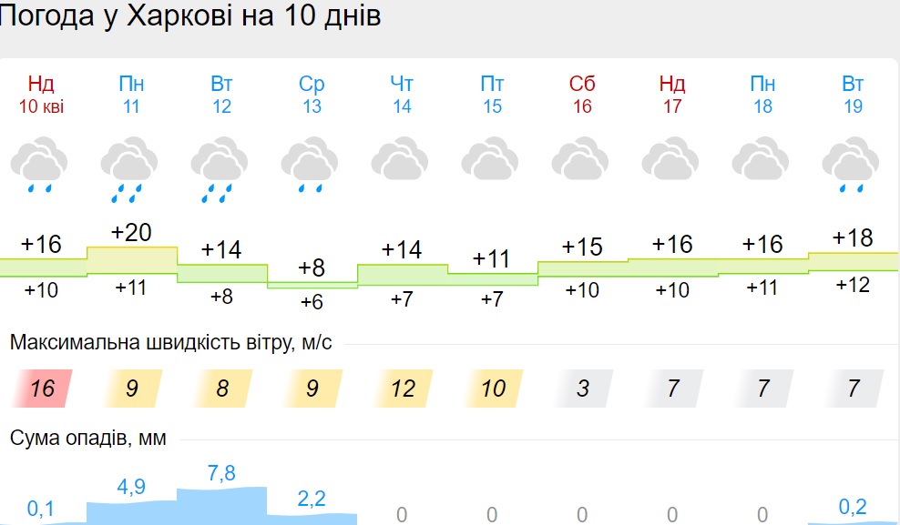 Так, в воскресенье, 10 апреля, дожди ожидаются в Винницкой, Киевской, Одесской, Харьковской, Черниговской областях.