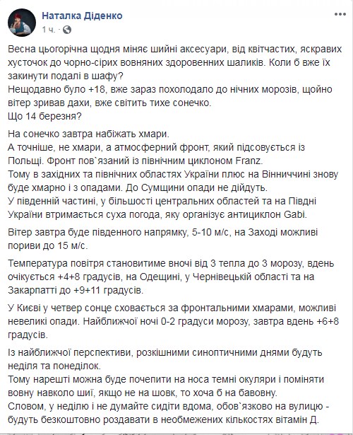 Об этом сообщает в Facebook синоптик Наталья Диденко.