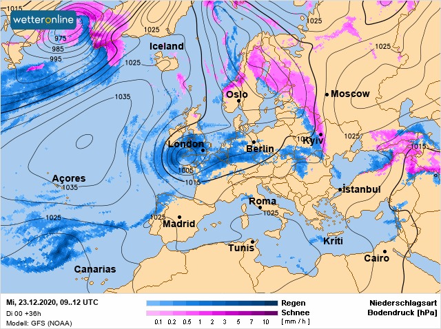 В среду, 23 декабря, Украину накроет атмосферный фронт, который принесет снег, мокрый снег, налипание мокрого снега и дождь.