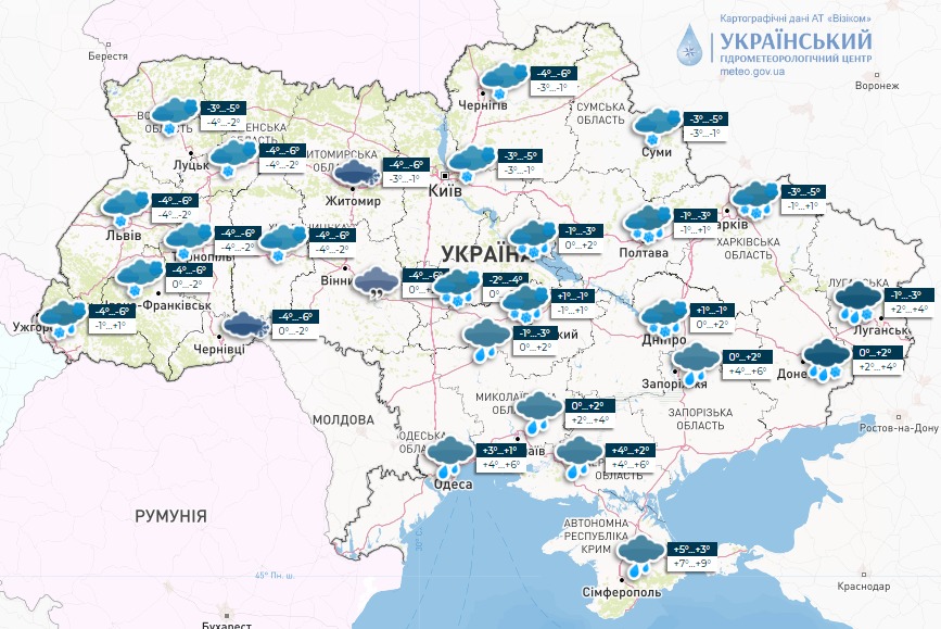 В центральных областях, Харьковской, Сумской областях снег, днем с дождем, гололедица, налипание мокрого снега, температура ночью и днем от 3° мороза до 2° тепла. На остальной территории местами небольшой снег, температура ночью 3-8° мороза, днем 0-5° мороза. На дорогах гололедица.