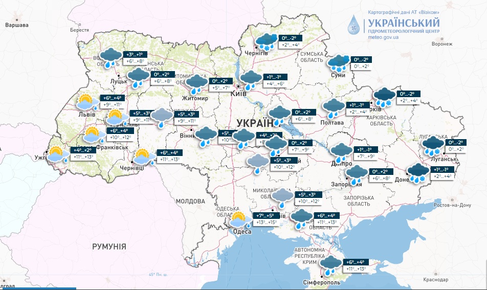 Украинский гидрометцентр на сегодняшний день публикует такую карту погоды: