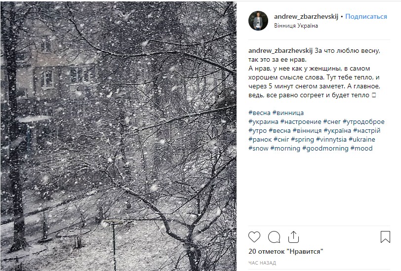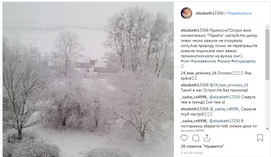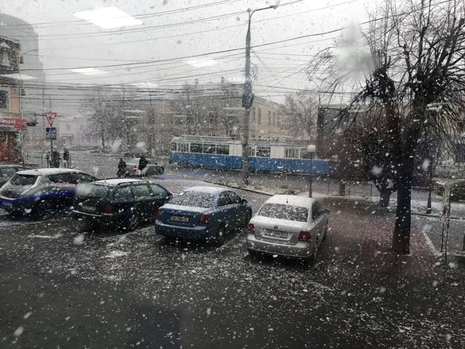 Снимки весенней непогоды публикуют пользователи соцсетей. В частности заметать начало Винницу и Острог Ровенской области.