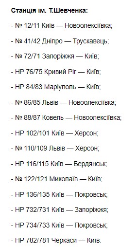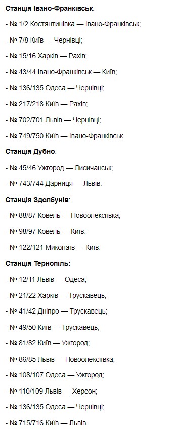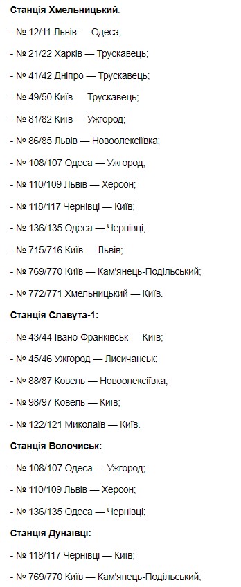 "По решению Государственной комиссии по техногенно-экологической безопасности и чрезвычайных ситуаций. Укрзализныця прекращает продажу билетов из отдельных железнодорожных станций. С 00:01 19 октября будет закрыто продажа билетов из железнодорожных станций Ивано-Франковск, Дубно, Здолбунов, Тернополь, Хмельницкий, Славута 1, Волочиск, Дунаевцы и им. Т.Шевченко", - говорится в сообщении.