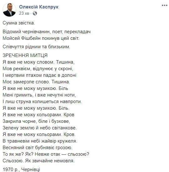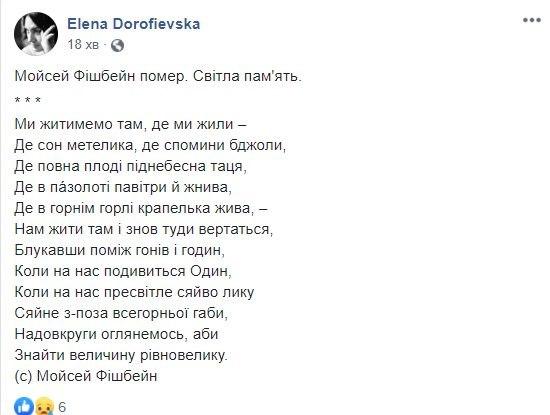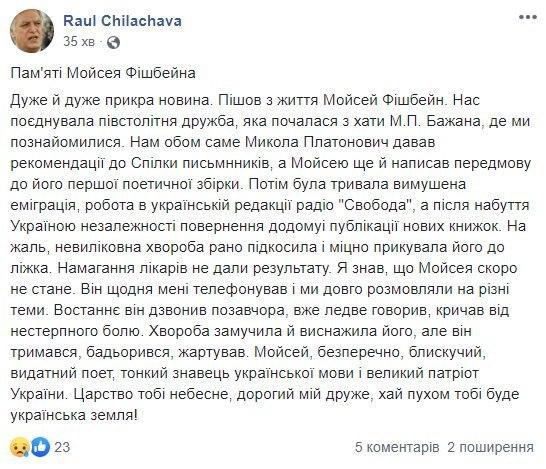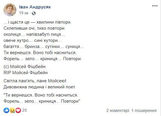 "Поэт. Украинец. Один из тех, кто неуклонно и последовательно защищал имя Украины от попыток обвинений в межнациональных проблемах. Четко и последовательно защищал родную страну от кгбистско-кремлевских обвинений в "антисемитизме", - написал, в частности, в своем поминальном посте на Facebok политик и общественный деятель Олесь Доний.
