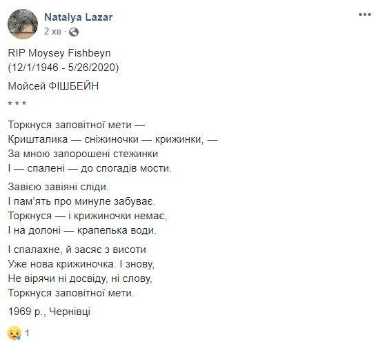 На смерть поэта со скорбью отреагировали пользователи соцсетей, публикуя воспоминания о встречах с Моисеем Фишбейном, а также его замечательные стихи.