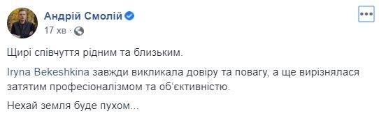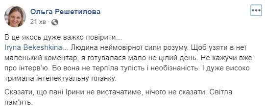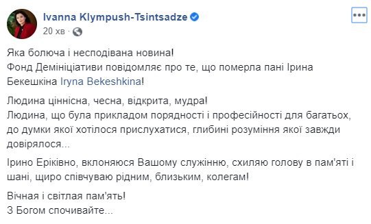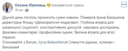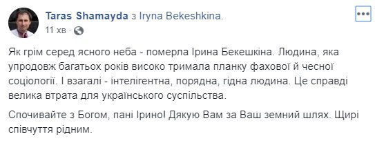 "Ирина Бекешкина была символом объективной украинской социологии, внесла весомый вклад в развитие демократии и гражданского общества, до последнего дня была с нами и проводила опросы, мероприятия, была переполнена новыми идеями и планами", - говорится в сообщении.