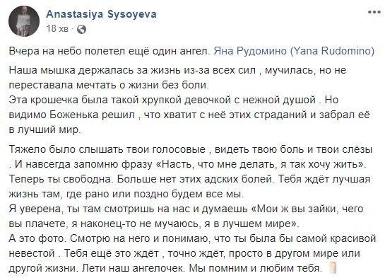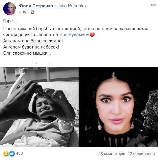 "Она долго боролась, в Израиле и Киеве, но болезнь оказалась сильнее. Приносим соболезнования родственникам и друзьям Яны. Светлая память", - написал он.