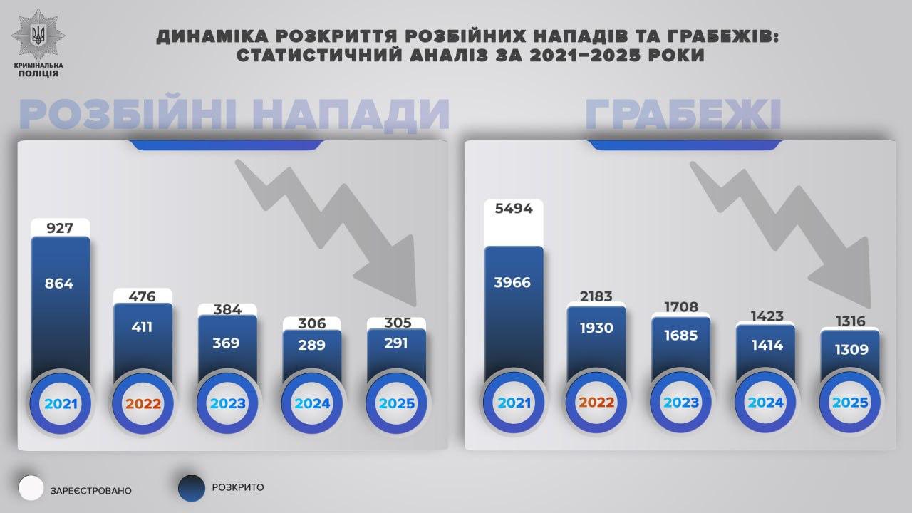 Согласно приведенным данным, в 2025 году в Украине зарегистрировано 1316 грабежей и 305 разбоев. Для сравнения: в 2021 году эти показатели были значительно выше – более 5000 грабежей и 927 разбоев.