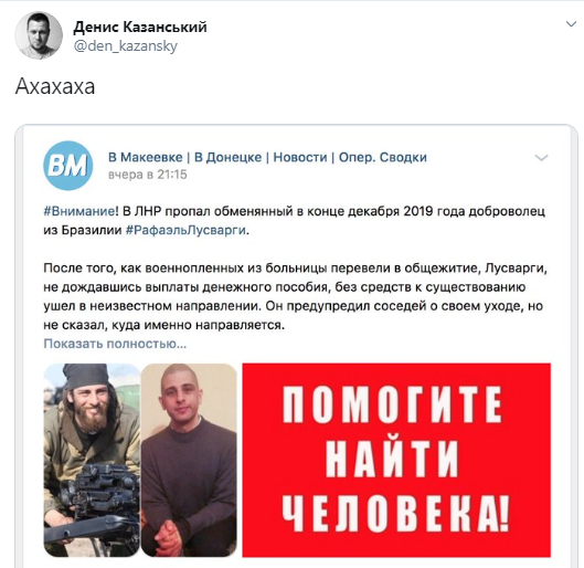 На временно оккупированной части Донбасса пропал террорист из Бразилии Рафаэль Лусварги, который был передан боевикам в рамках обмена удерживаемыми лицами.