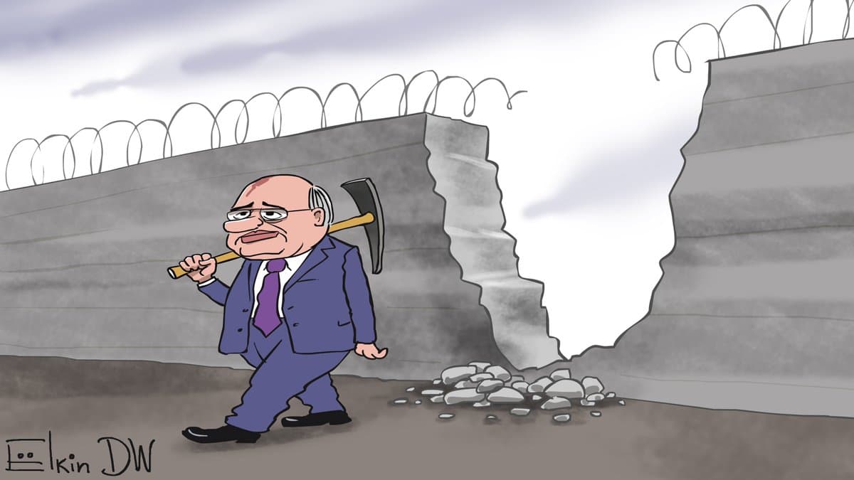 Сатирическую картинку известного художника-карикатуриста Сергея Елкина опубликовало издание Deutsche Welle в своем Twitter.