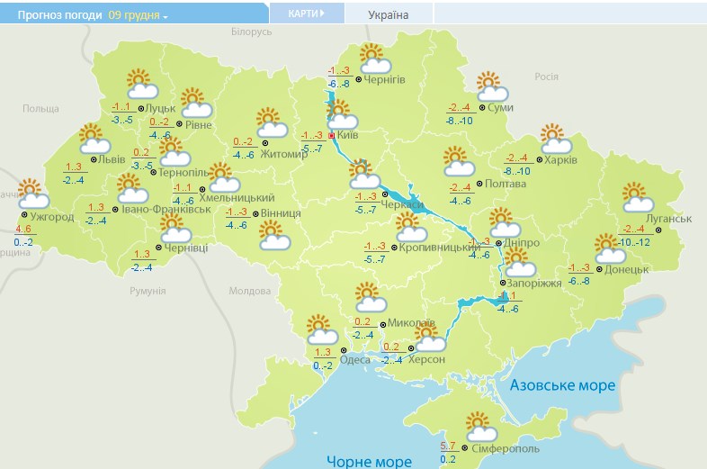 Днем будет 0-4 градуса мороза. В южных и западных областях - около нуля, в Крыму и на Закарпатье теплее - 2-7 градусов тепла.