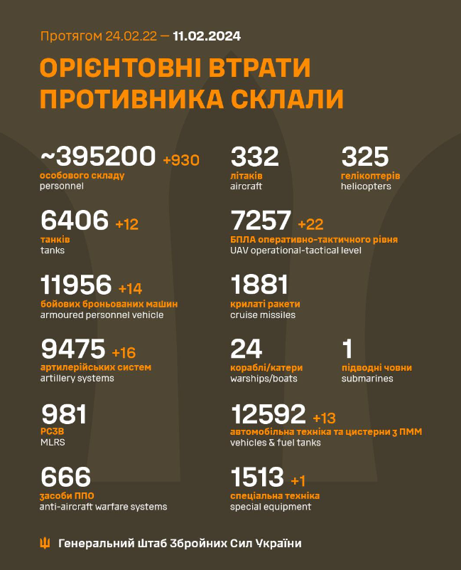 По состоянию на 11 февраля, 718-й день полномасштабного российского вторжения, украинские защитники ликвидировали 930 оккупантов, а также уничтожили много военной техники врага, в частности, 16 артиллерийских систем и 12 танков.