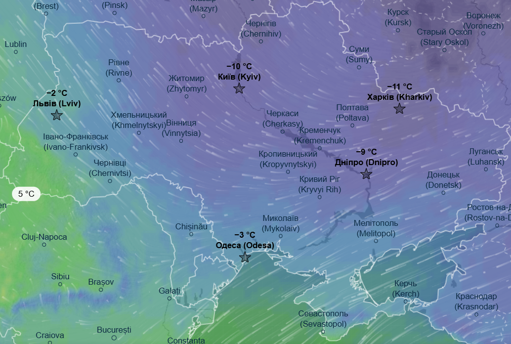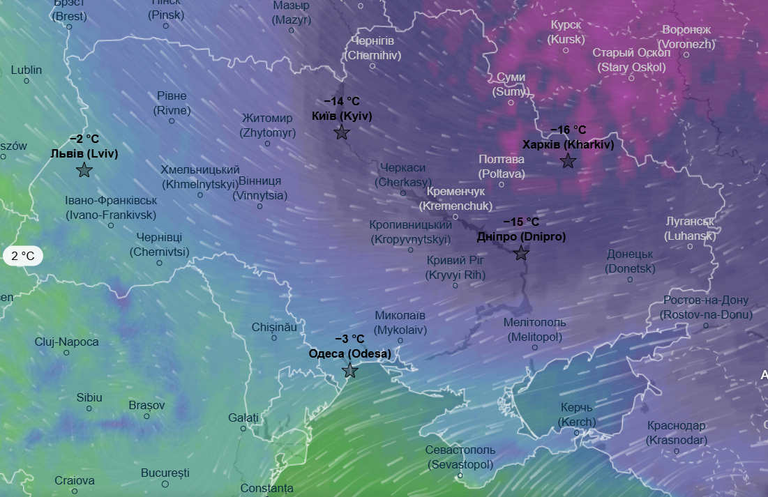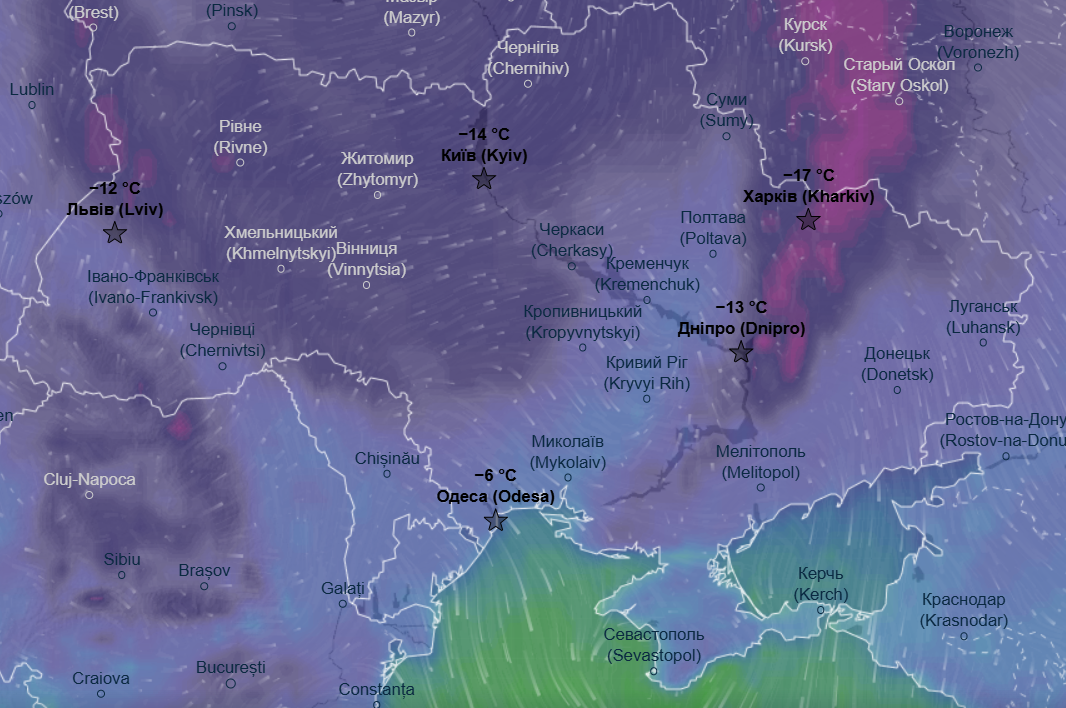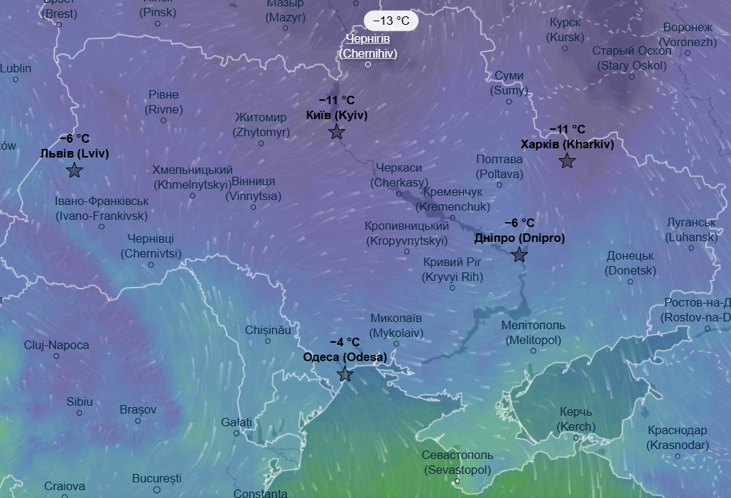 Днем также воздержатся морозы - от -6 до -14 °С. Теплее будет только в Одесской и Запорожской области, там дневной максимум составит до -1 °С.