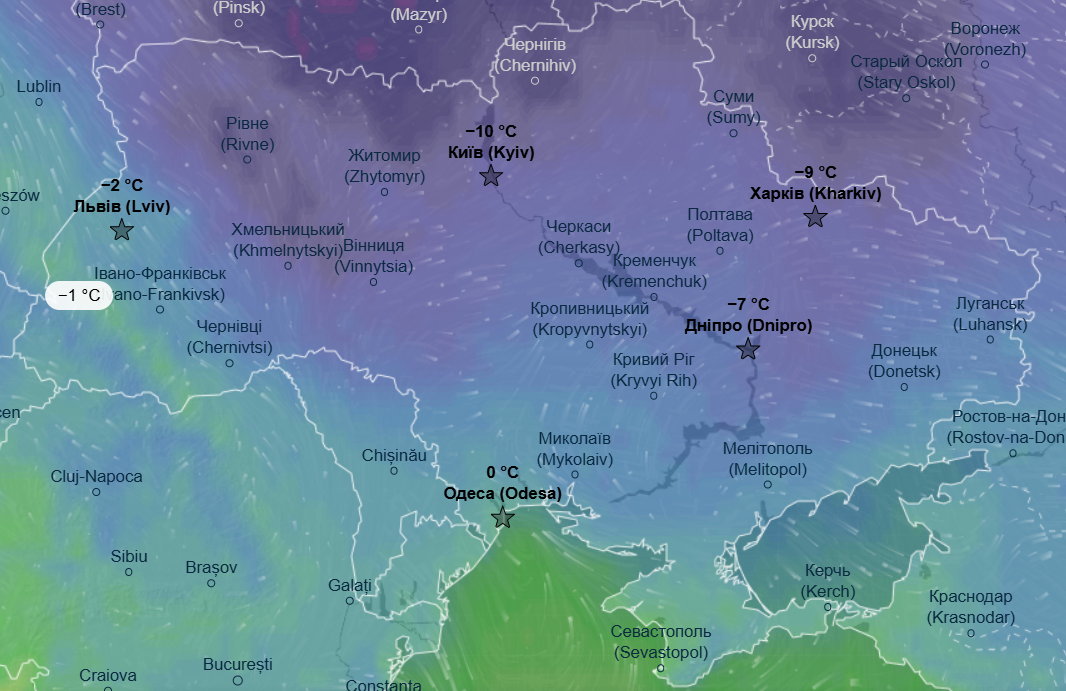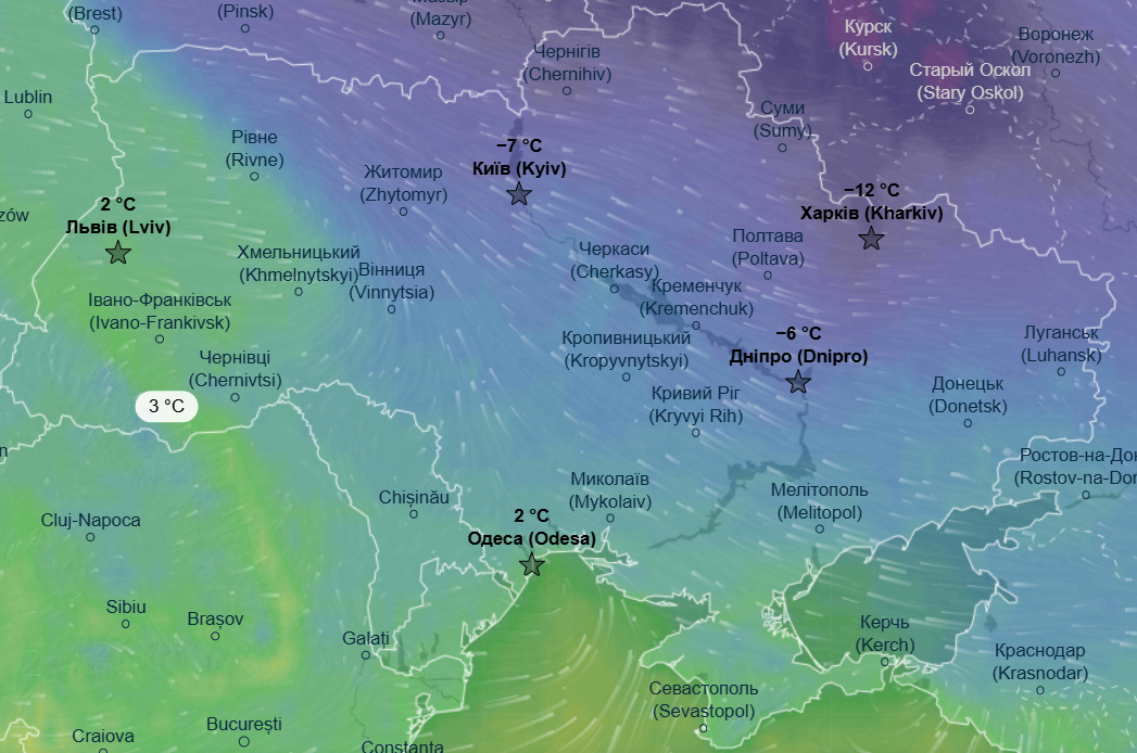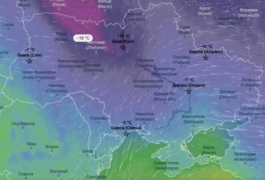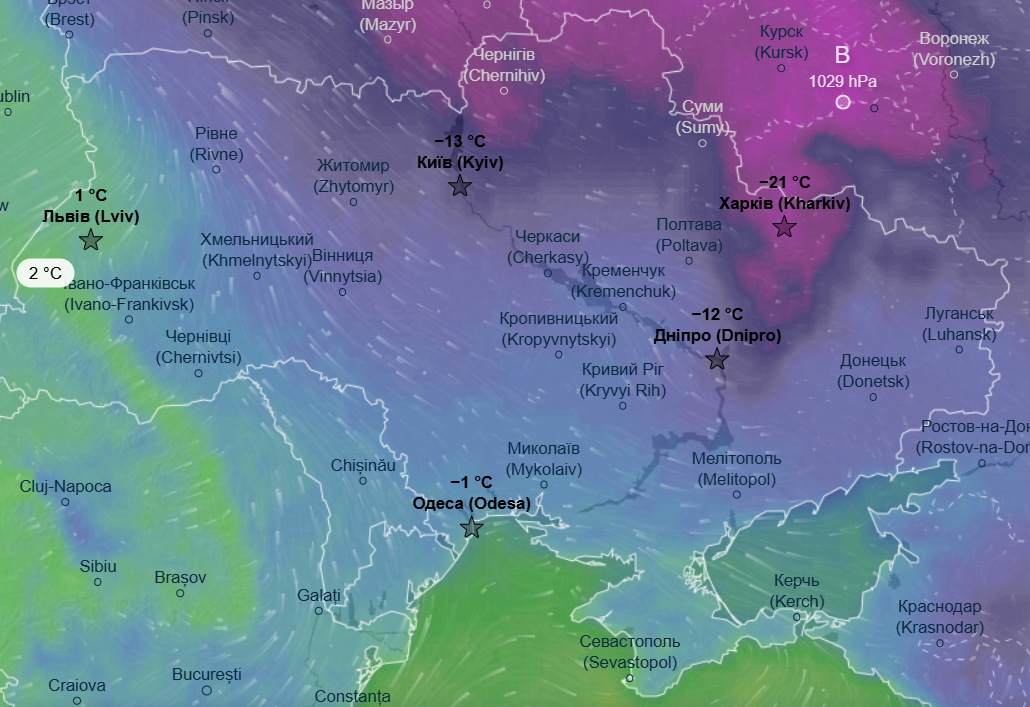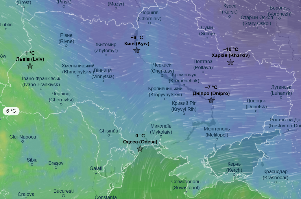 Днем также воздержатся морозы - от -6 до -14 °С. Теплее будет только в Одесской и Запорожской области, там дневной максимум составит до -1 °С.