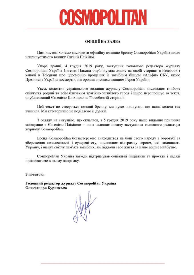 "Весь коллектив украинского издания журнала Cosmopolitan выражает глубокие соболезнования семье и всем близким трагически погибшего героя и искренне извиняется за текст, опубликованный Евгенией Плихиной на ее личной странице. Этот текст не касается позиции бренда, мы очень сожалеем, что наша коллега так поступила. Мы категорически не разделяем ее мысли", - написала редактор.