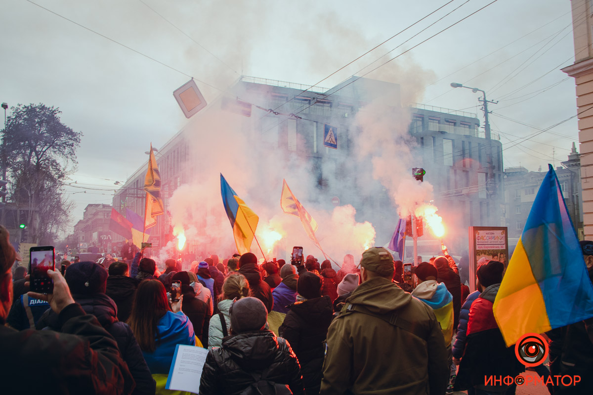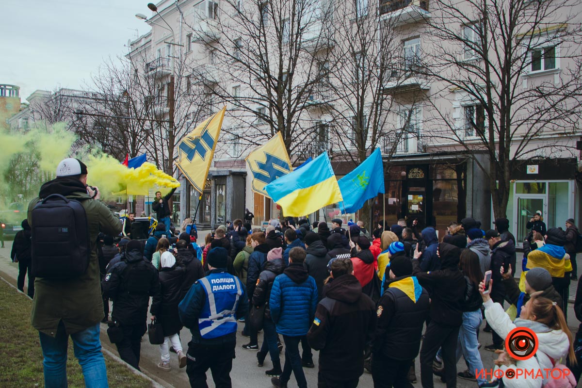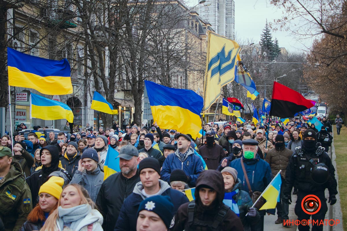 Позже люди выстроились в большую колону и двинулись вниз по проспекту Яворницкого в сторону Европейской площади. По данным журналистов, множество участников "Марша единства" принесли с собой сотни флагов и другой патриотической атрибутики.